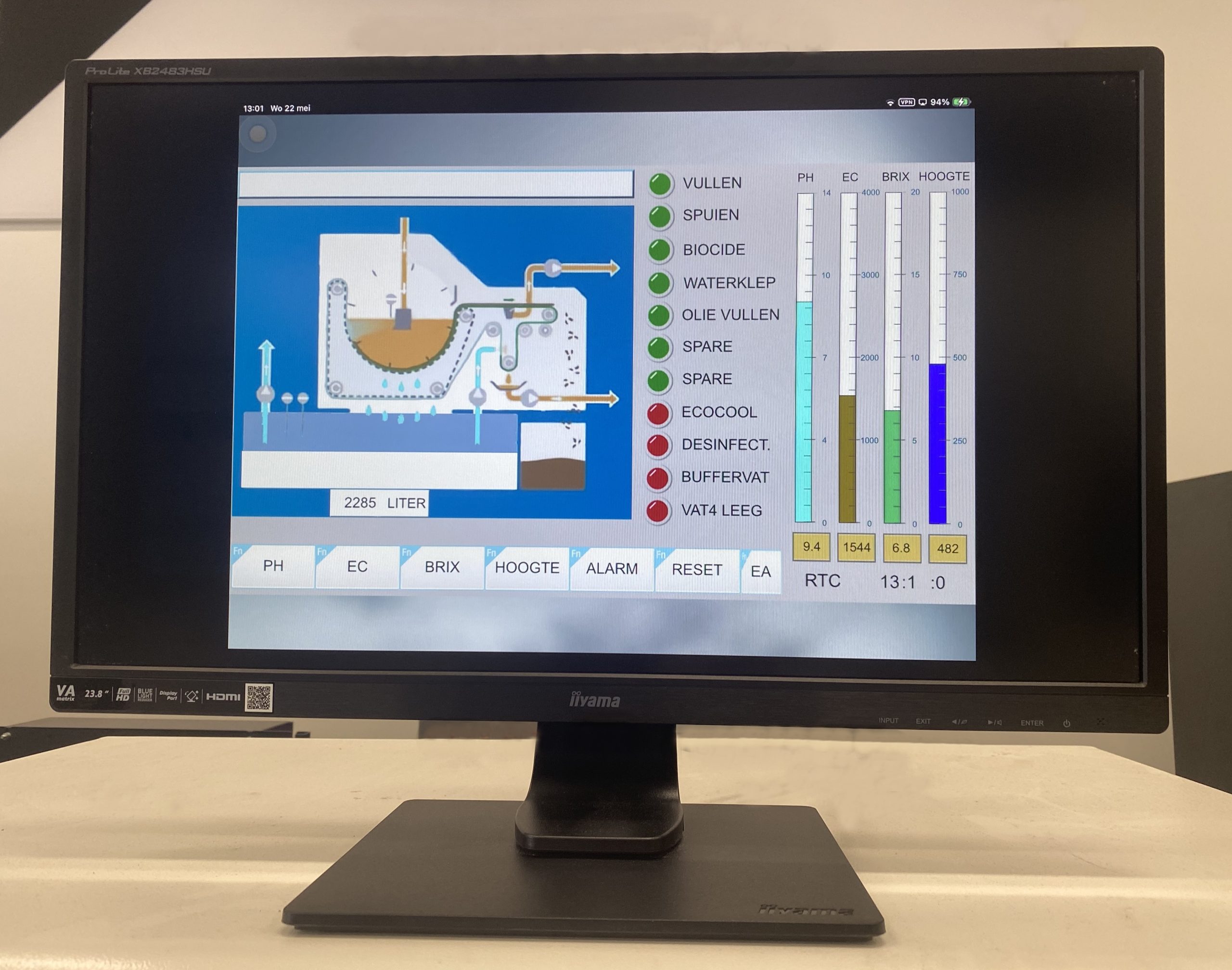 Realtime monitoring van de conditie van metaalbewerkingsvloeistoffen op basis van parameters zoals Brix, pH, geleidbaarheid (EC), vloeistofniveau en temperatuur.